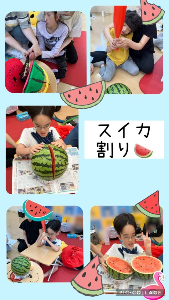 【夢来】スイカわり🍉 こんにちは😊 先日スイカわりをしました🍉 夢来2号さんも駆けつけみんなでスイカをポンポンと叩き楽しみました🌞 割れたスイカはそのまま食べたりスイカジュースで飲んでみたり フロア中がスイカの匂いで包まれて 味や香りを満喫しました🍉 2025年09月29日